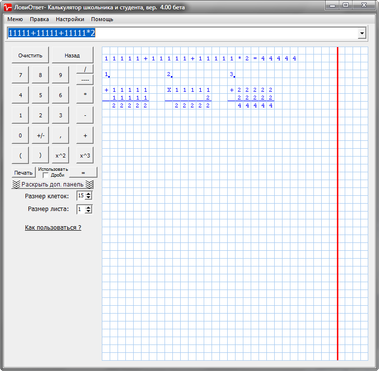 Лови Ответ v.4.00- это небольшая программка, которая поможет Вам решить математические примеры любой сложности, при этом отображая этапы решения. Все действия выполняются "в столбик". С помощью программы Вы с лёгкостю сможете проверить правильность решения домашних заданий по математике Ваших детей.